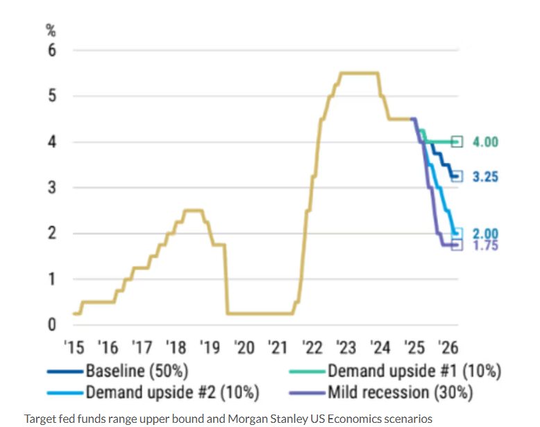 摩根士丹利利率策略團隊在更新經濟預測後指出,其基準預測為聯準會本月會議降息25 個基點,並在2026 年12 月之前,每隔一次會議實施同等幅度的降息。但在評估美國經濟的多種可能性後,該機構認為,綜合各類情境的機率加權,聯準會的利率路徑可能比基線預測更「鴿派」。具體來看,摩根士丹利預計2025 年至2026 年期間,聯邦基金利率可能比目前預期下降更快,甚至可能低至2.25%,儘管這段期間的利率終點或略高於此,約為2.75%。